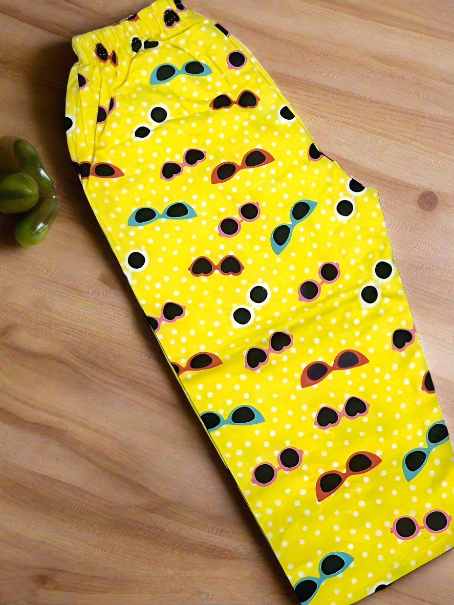 Pants: The pants feature the playful sunglasses print on a bright yellow background, complemented by white polka dots. The elastic waistband ensures a comfortable and secure fit for your child.