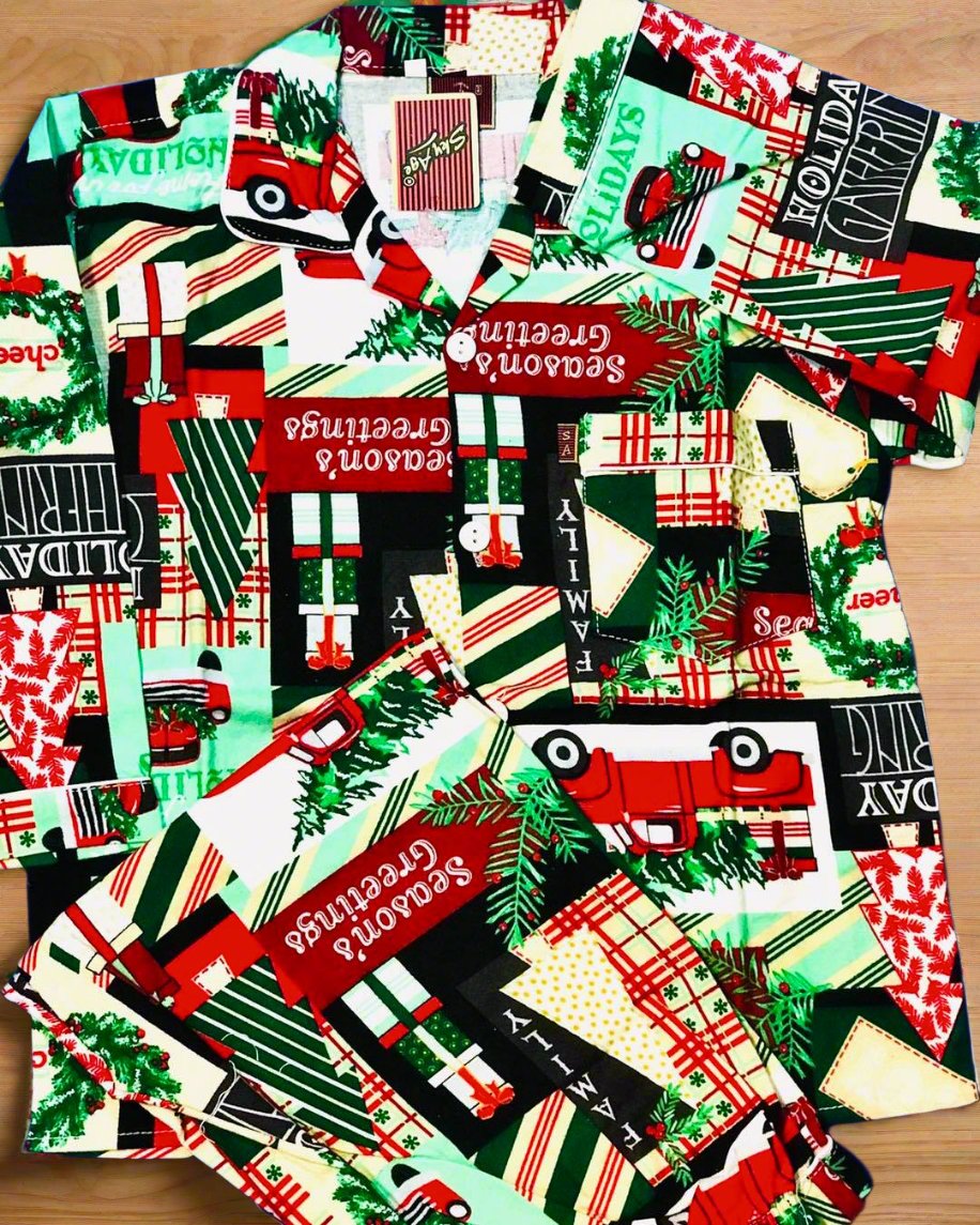 - Adorable Festive Design: The night suit features a delightful patchwork of classic holiday motifs, including cheerful wreaths, vintage red trucks, Christmas trees, and playful greetings like "Season's Greetings" and "Happy Holidays." The vibrant red, green, and white color palette is perfect for the festive season.