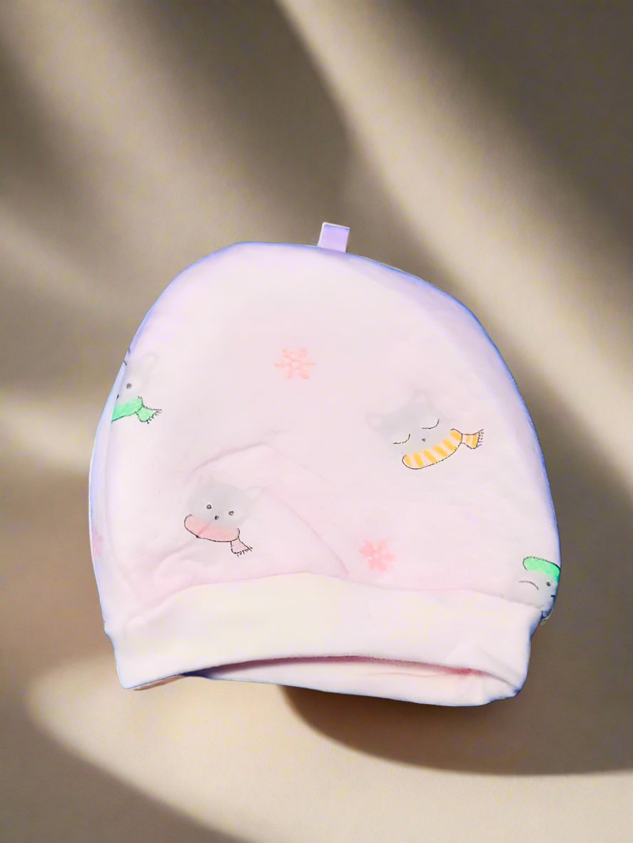 Welcome your little one with this charming and cozy newborn romper set, perfect for baby girls. This delightful set includes a hat, footed pants, a bib, and a long-sleeve top, all in a soft pink hue adorned with adorable bear illustrations. The cute bear faces, complete with little scarves and winter hats, bring a playful and endearing touch to your baby's wardrobe.