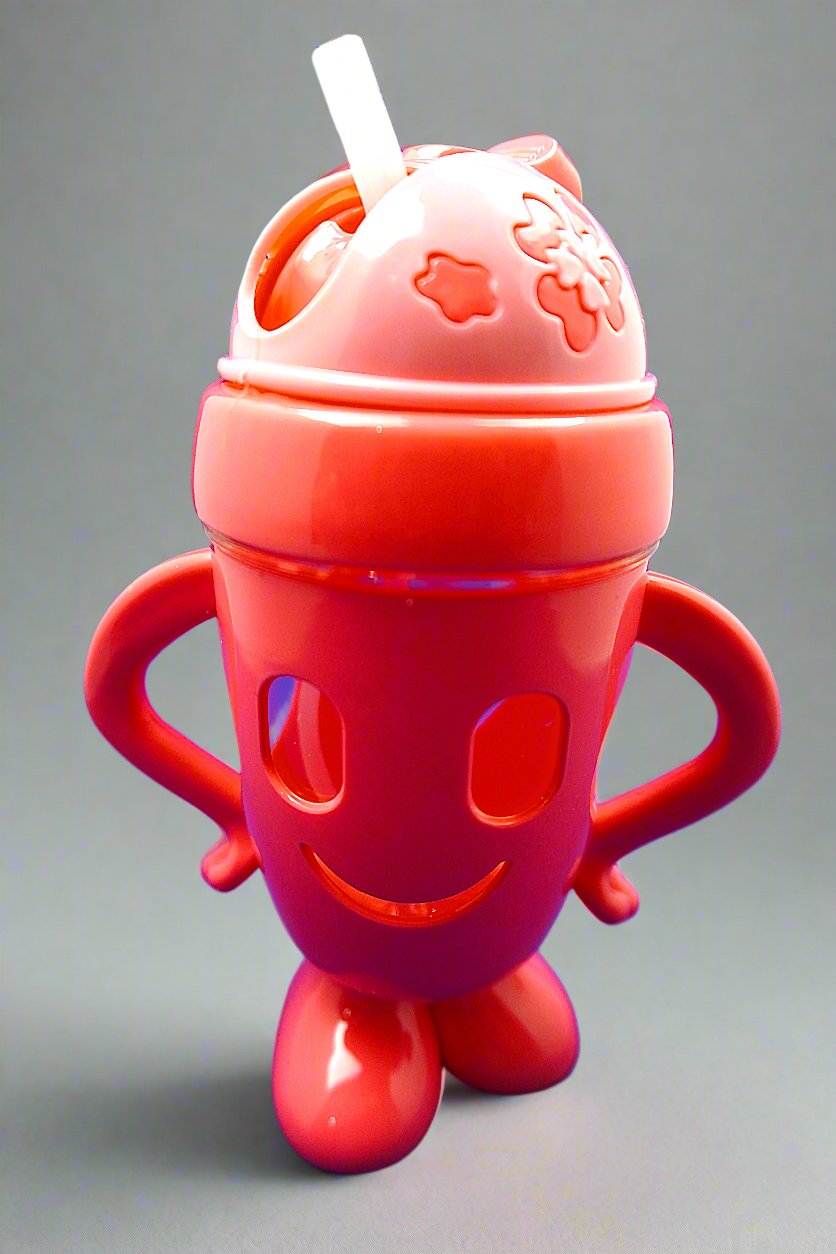 Crafted in vibrant pink and red tones, the cup features a delightful smiling face with cut-out eyes that peek at your child as they sip. The ergonomic handles on either side make it easy for little ones to grip, encouraging independence while reducing spills. The cup is topped with a cute dome-shaped lid adorned with flower patterns, adding an extra touch of charm.